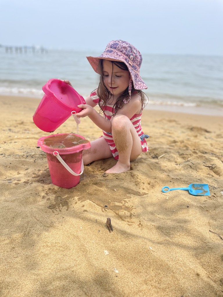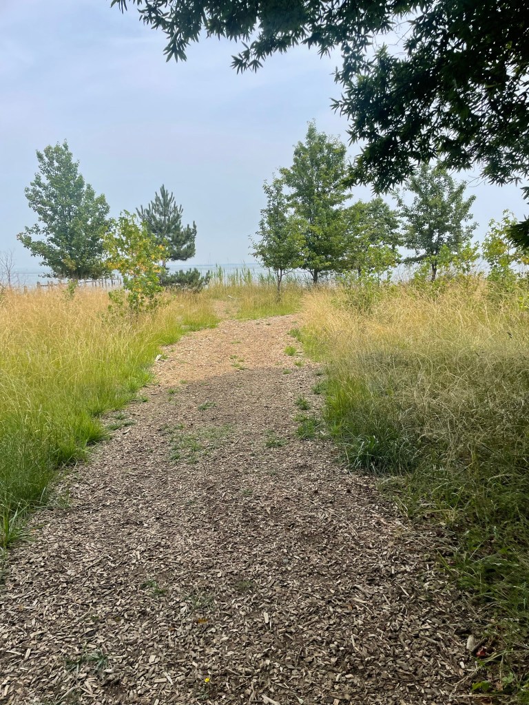 It’s a short walk on the dirt path to the narrow and short beach. There is a bench and a few chairs out. The sand was a bit orangy but soft, and a bunch of rocks and shells for Lucy (and one other lady who was there) to collect. The water was a tepid cold which felt great on this hot and murky day. Swimming is not allowed, and it does appear to not be as shallow a few feet out. But great for getting the feet wet.
