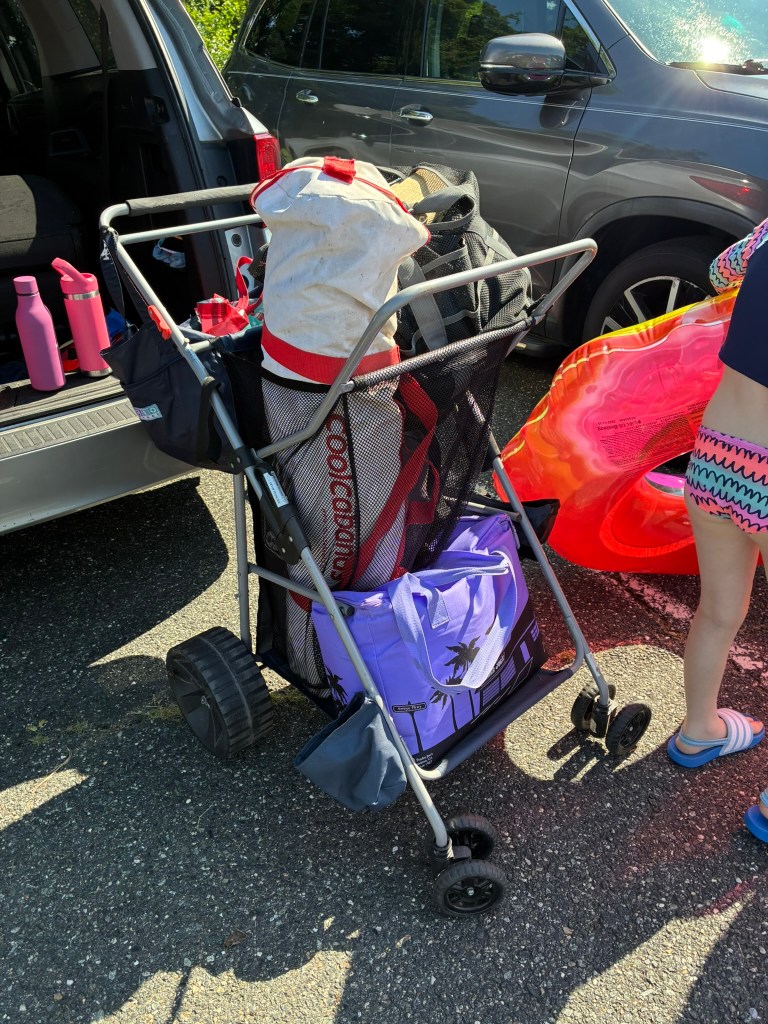 Our recent tool is a Rio beach cart I bought used from a local listserve. I’m moderately happy with it. It folds up easily to get in/out of the car, and has a good storage structure.